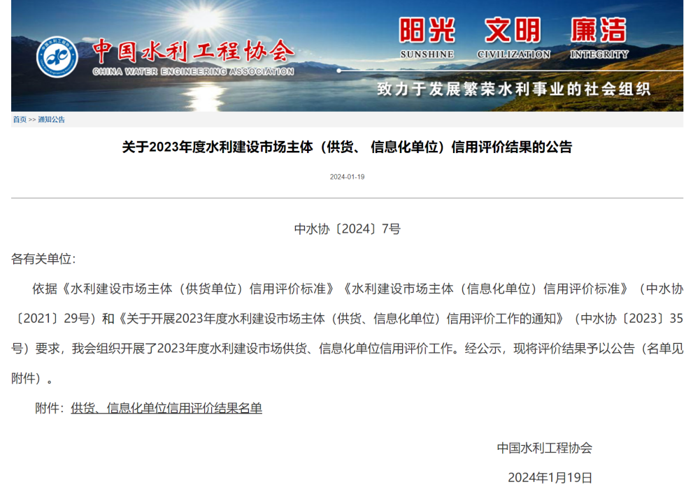 2024年1月19日,中國水利工程協會發布了《關于2023年度水利建設市場主體(供貨、信息化單位)信用評價結果的公告》。在此次評價中,金控數據以其卓越的綜合實力和良好的信用記錄,榮獲“全國水利建設市場主體AAA級信用評價”。